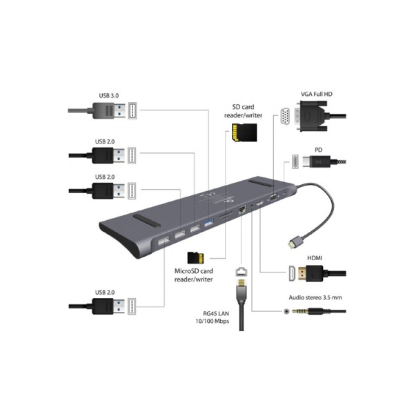 | პორტები | 1 x USB Type-C (PD Max. PD 2.0 up to 87 W), 1 x VGA, 1 x 3.5 mm Audio Jack, 1 x RJ45, 3 x USB 2.0, 1 x HDMI (4K/30Hz), SD card-reader (SD and MicroSD formats, supports cards up to 128 GB) |