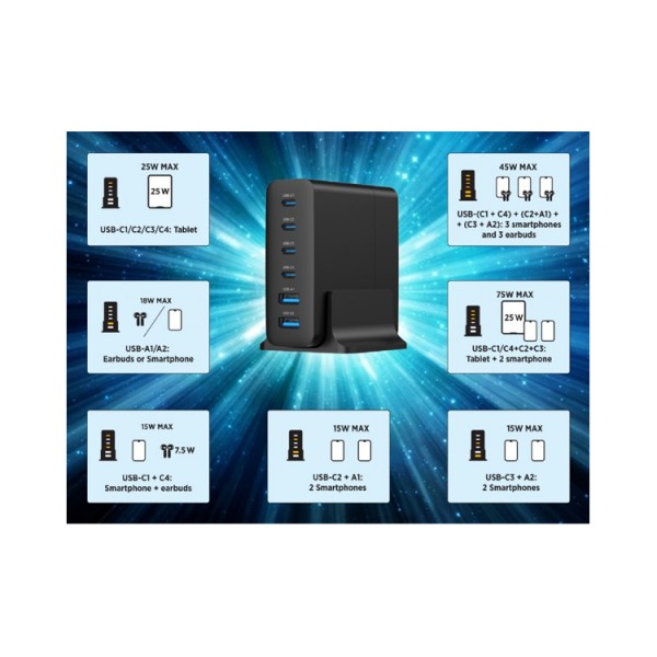 | გამომავალი ძაბვა | USB-C1+C4: 5.0V / 3.0A (Max. 15W), USB-C2+A1: 5.0V / 3.0A (Max. 15W), USB-C3+A2: 5.0V / 3.0A (Max. 15W), USB-C1/C2/C3/C4: 5.0V / 3A, 9.0V / 2.77A, 12V / 2.08A (Max. 25W), C1/C4+C2+C3:25W+25W+25W (Max. 75W), USB-A1/A2: 5.0V / 3.0A, 9.0V / 2.0A, 12.0V / 1.5A (Max. 18W), USB-(C1+C4)+(C2+A1)+(C3+A2)= 5.0V / 3.0A+5.0V / 3.0A+5.0V / 3.0A (Max. 45W) |