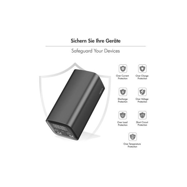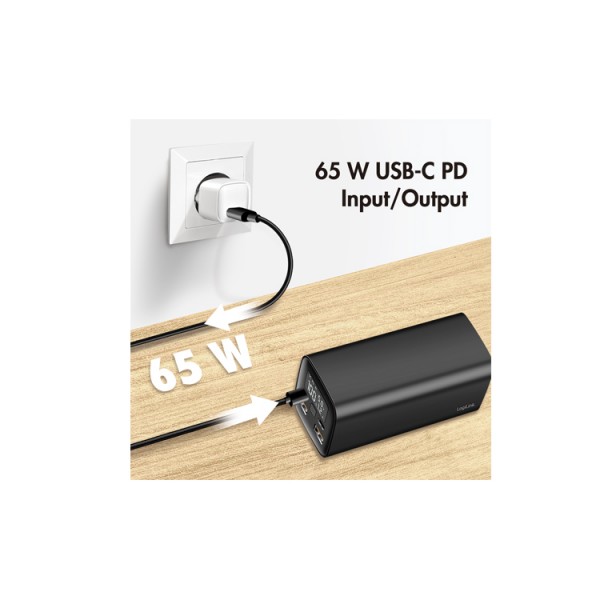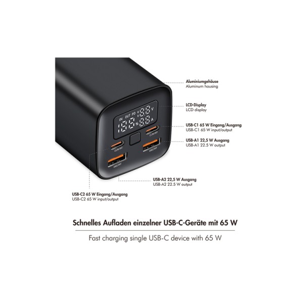 | გამომავალი ძაბვა | USB-C1/C2: 5 V/3 A (15 W), 9 V/3 A (27 W), 12 V/3 A (36 W) 15 V/3 A (45 W), 20 V/3.25 W (65 W max.) USB-C1+C2: 5 V/3 A (15 W), 9 V/3 A (27 W), 12 V/3 A (36 W) 15 V/3 A (45 W), 20 V/2.25 W (45 W+45 W=90 W max.) |