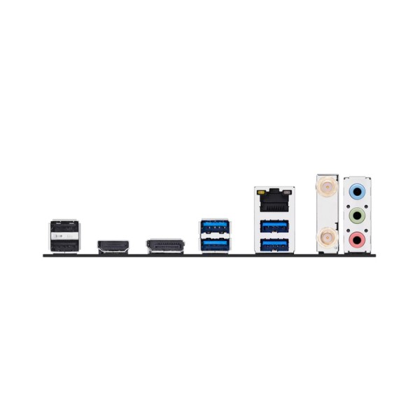 | უკანა I/O პორტები | 1 x Wi-Fi module , 4 x USB 5Gbps ports (4 x Type-A), 1 x HDMI, 3 x audio jacks, 1 x DisplayPort, 2 x USB 2.0 ports (2 x Type-A), 1 x Realtek 1Gb Ethernet port |